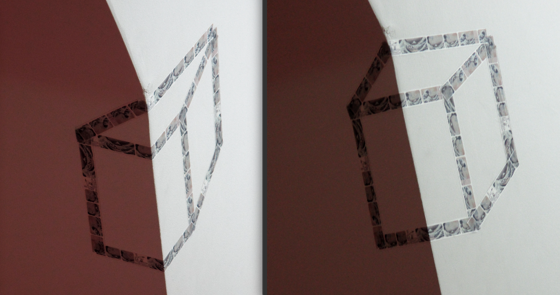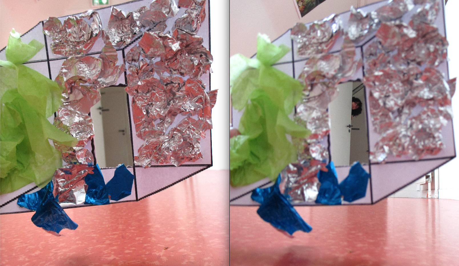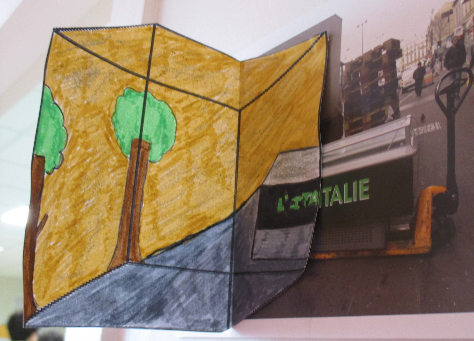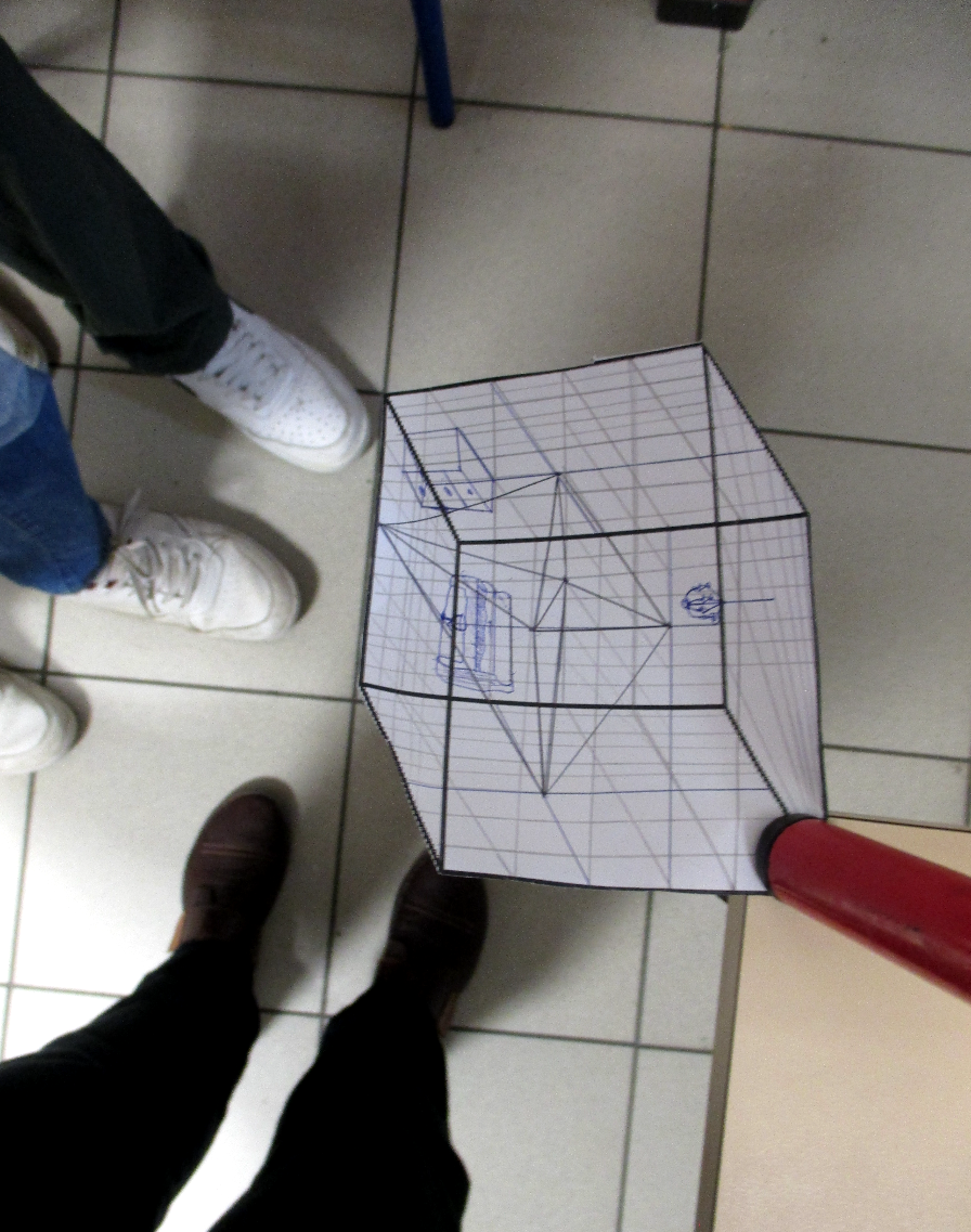 Étranges illusions réalisées, en binôme, par le niveau troisième. Incitation : « Transformer l’espace » Travail graphique et prise photographique. Bonne visite virtuelle. Mme Gregov.