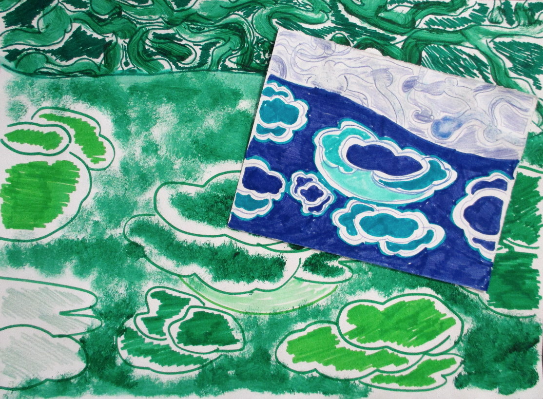 Les élèves de cinquième ( 5A, 5C, 5S) ont réalisé un camaïeu puis l’ont reproduit en variant ses nuances. L’image dans l’image… Tout un programme !!