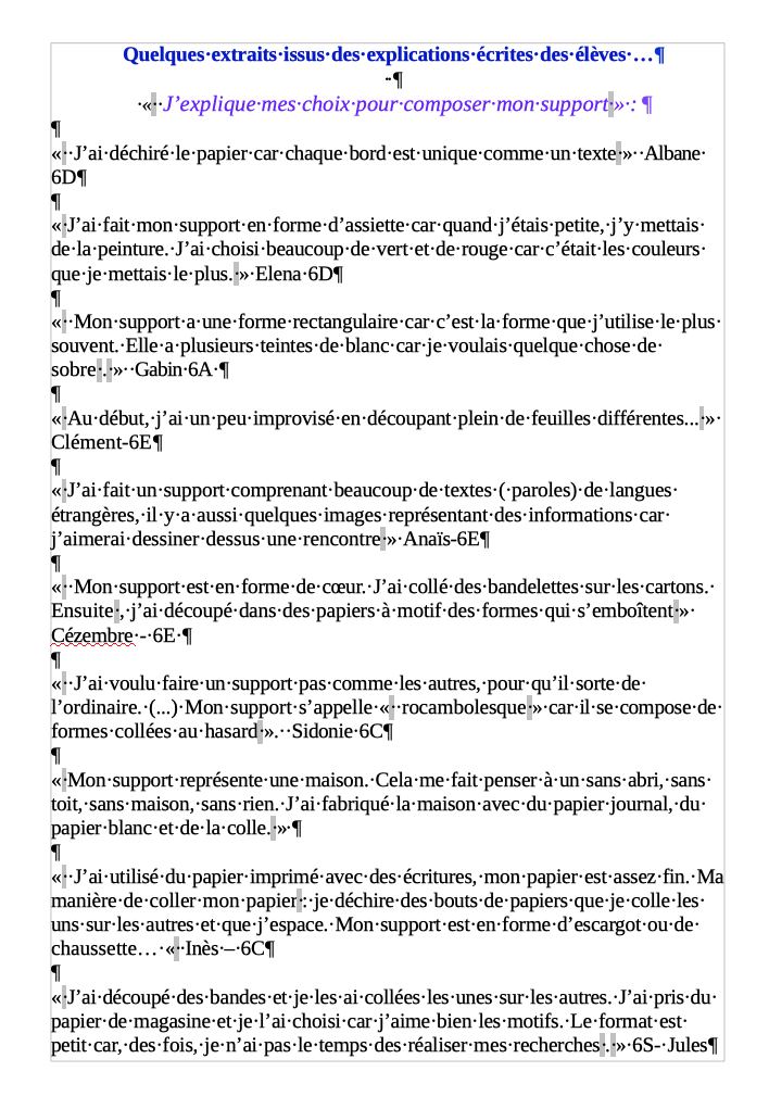Après avoir expliqué leurs choix à l’écrit ( choix du papier, techniques d’assemblage, forme obtenue…), ils ont réalisé un dessin s’inspirant des éléments de leur support. Bonne visite virtuelle. Mme Gregov
