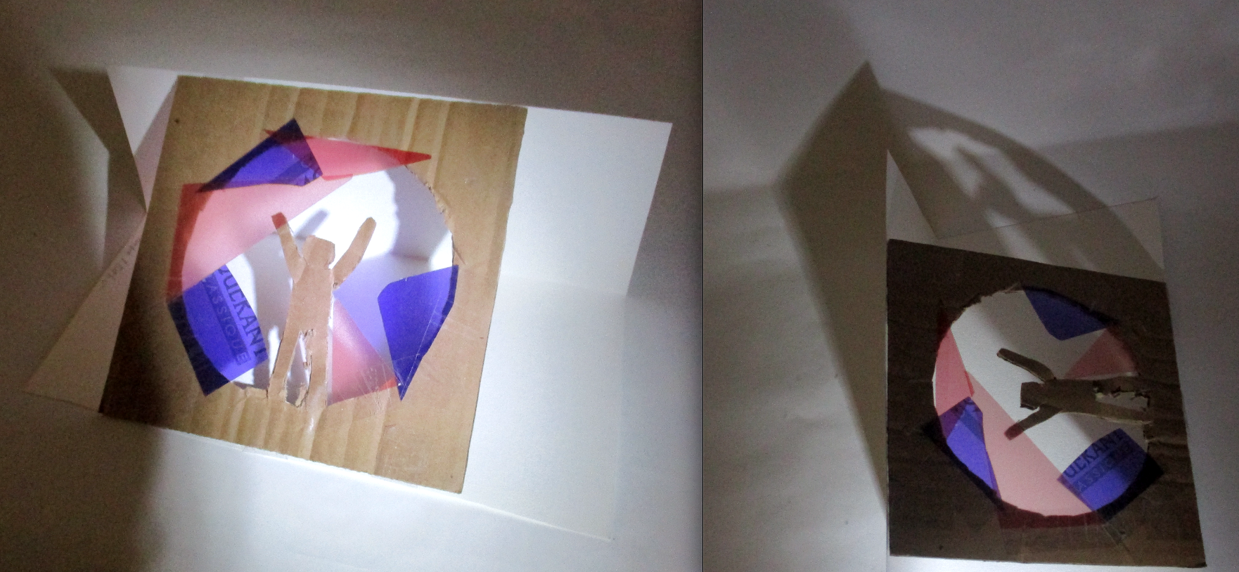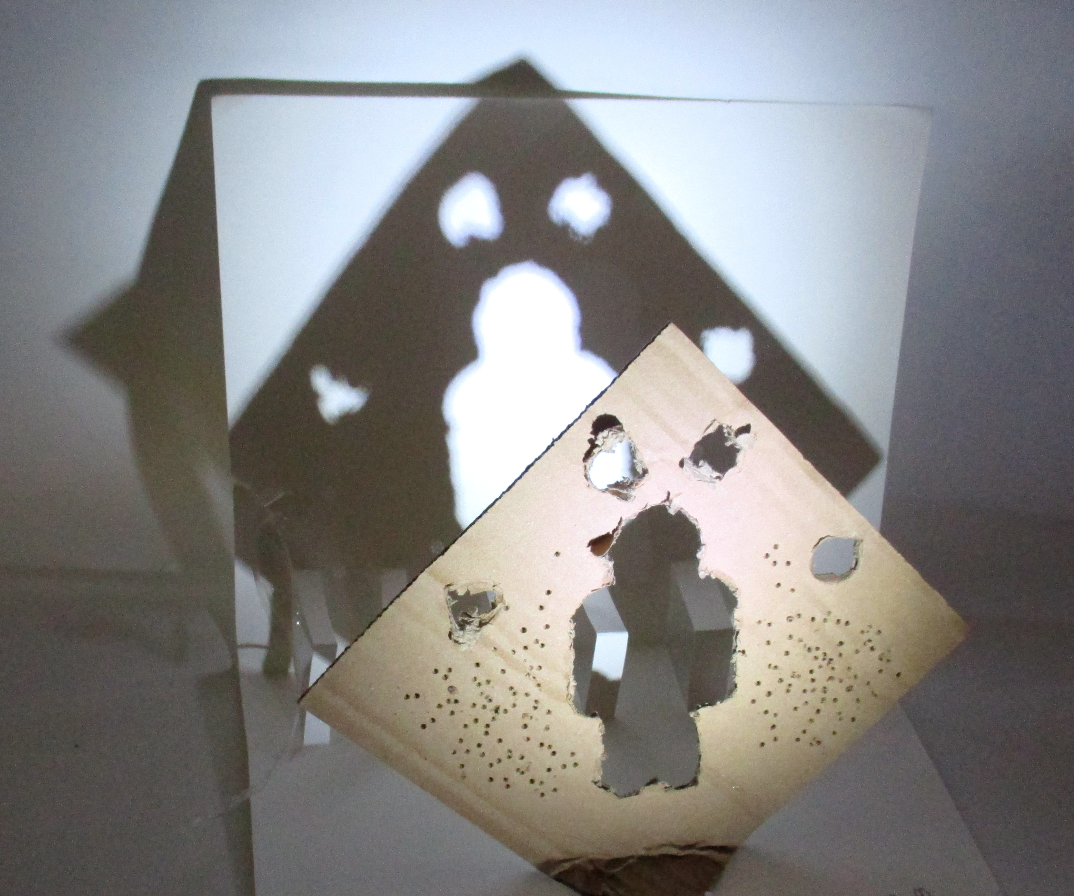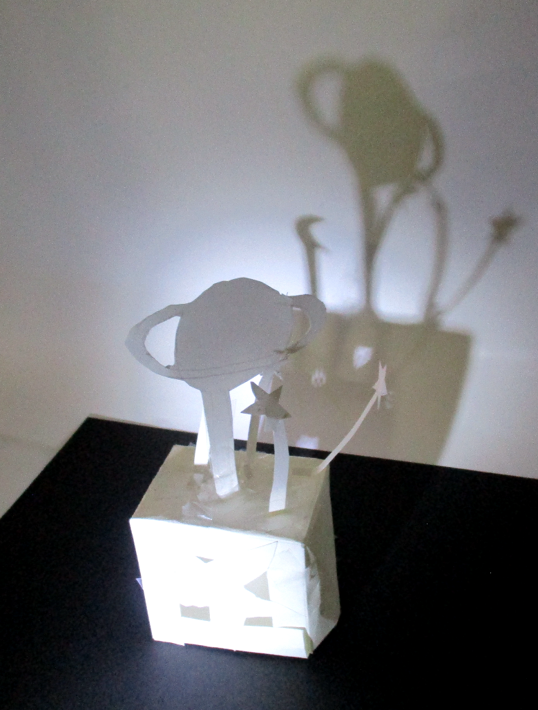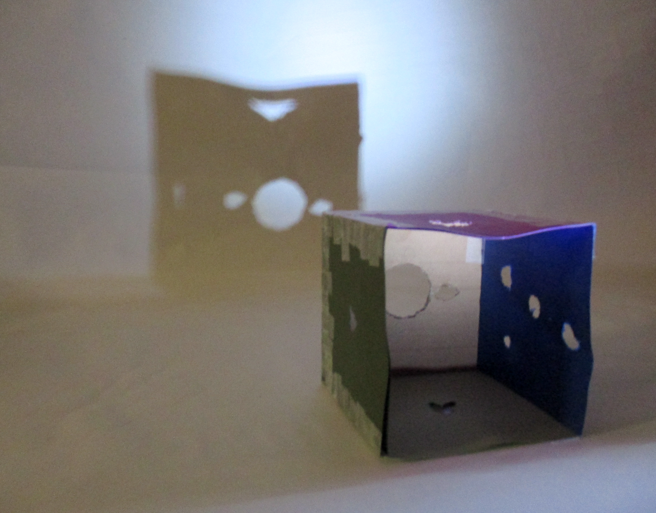 Les élèves de troisième ( E,A,F,D) ont réalisé, lors d’une recherche en binôme, des volumes jouant d’éclairages divers et d’ombres portées.