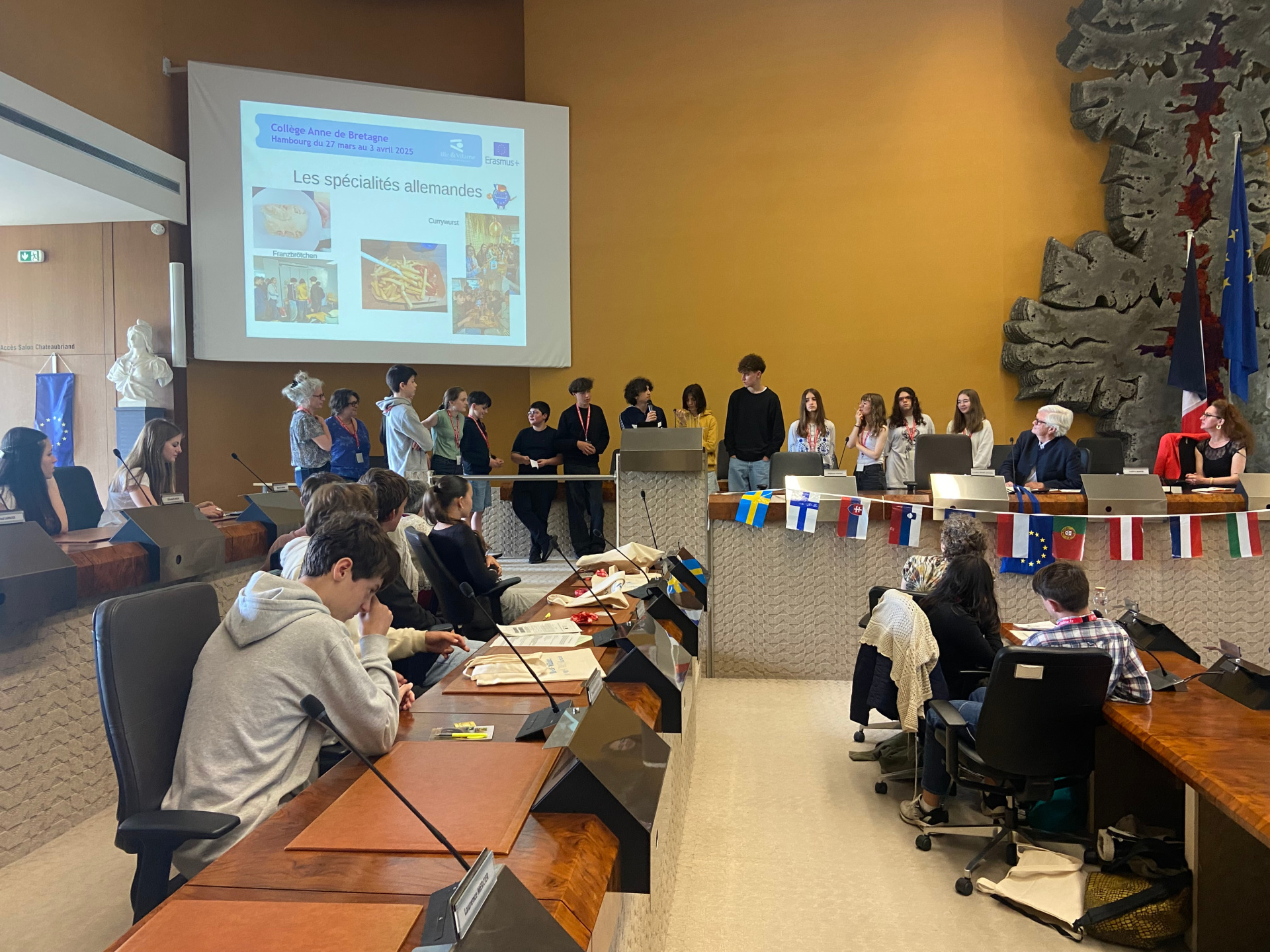 Petit moment de stress en entrant dans la solennelle salle de l’Assemblée de l’Hôtel du Département d’Ille et Vilaine : c’est là que dans quelques minutes la délégation de germanistes du collège Anne de Bretagne, accompagnée de N. Saidoune et C. Petitjean, va présenter le projet Erasmus+ (V)entre Européennes devant une asssemblée d’élues, de personnels du Département, de collégiennes et de personnels de l’Éducation Nationale. Le diaporama est prêt, quelques révisions de dernière minute, des questions pratiques ou inquiètes, il va falloir y aller. Présentation vivante et bien menée, bravo ! Les élèves ont parlé avec un enthousiasme convaincant des bienfaits du voyage en train et de leur expérience avec leurs correspondantes allemandes de Hambourg. Ils sont maintenant plus détendus pour répondre aux questions de l’assemblée : questions gourmandes sur la thématique culinaire de la Currywurst ou questions sur la mascotte du projet qui a remporté un franc succès. Après un pique-nique au soleil, les élèves et les enseignantes des différents établissements du consortium Erasmus+ CD35 ont pu partager leurs expériences lors d’ateliers, avant une dernière réunion sous le signe du plurilinguisme.